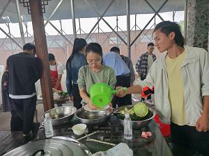 農(nóng)家柴火土灶對90后們更是一場考驗(yàn),隨機(jī)分成3組,各小組成員分工合作,生火、洗菜、切菜、掌勺.....隊(duì)友們一起商討配菜、生火技巧、切菜形狀,實(shí)在動(dòng)不了手的隊(duì)友就剝蒜、搬柴、洗碗。